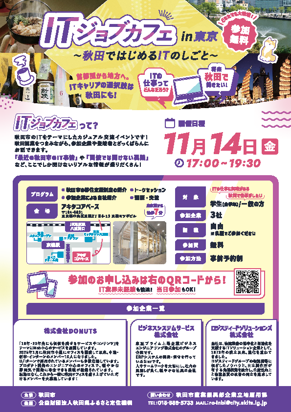 【秋田市主催】ITジョブカフェin東京〜秋田ではじめるITのしごと〜(11/14(金)午後5時~)